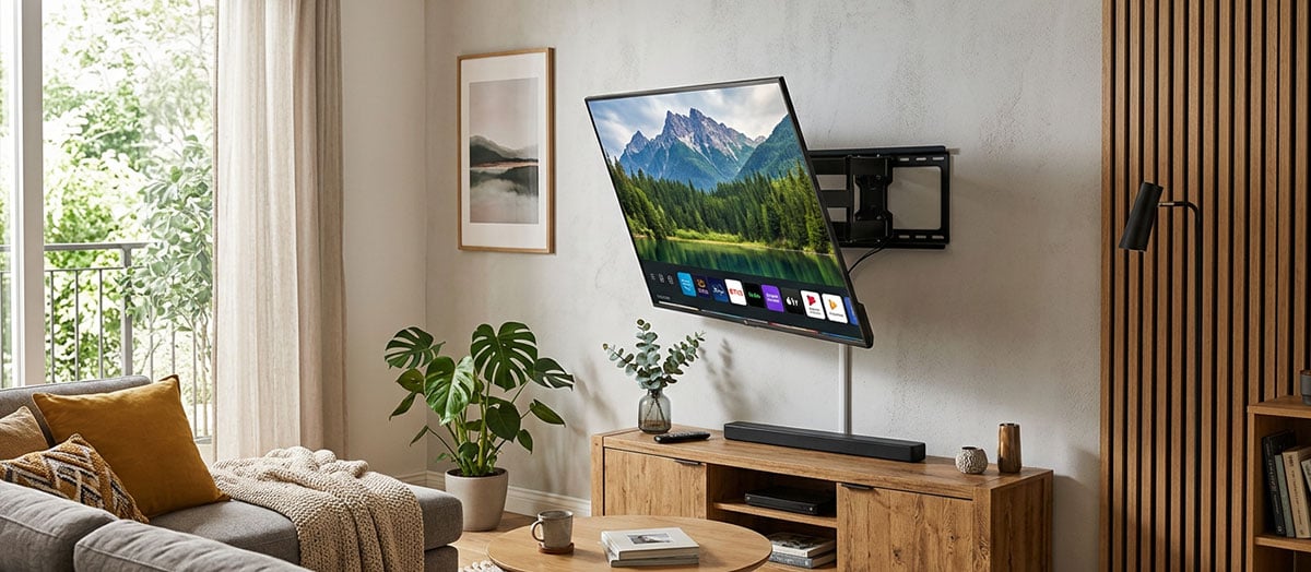 Los soportes giratorios (full motion) permiten la rotación izquierda–derecha, el ajuste de la distancia a la pared y la inclinación de la pantalla. Esta solución ofrece la mayor flexibilidad de posicionamiento.